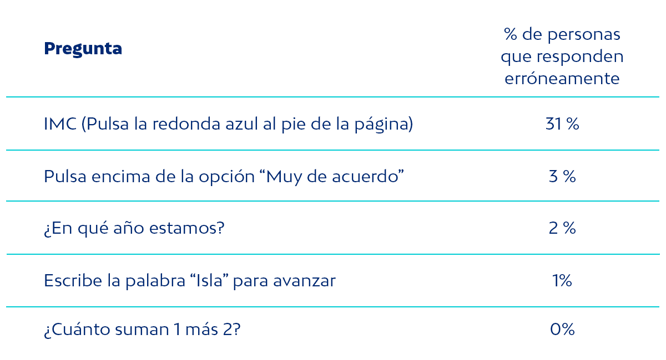 Ahora bien, debemos hacer notar que hay preguntas trampa más o menos eficientes y que su diseño tendrá un gran impacto en el número de participantes que identificaremos. En un experimento interno realizado en Netquest, hemos obtenido los siguientes resultados: