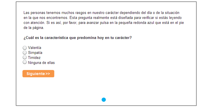- Detectar a la persona deshonesta, es decir, es deseable que no se pueda pasar a la siguiente pregunta respondiendo al azar.