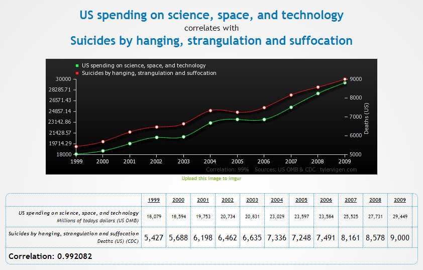 Existen muchos ejemplos de este fenómeno. En Xataka mencionan el polémico asunto de la homeopatía. Los consumidores de este tipo de productos perciben una mejoría en su patología y la atribuyen al producto ingerido, cuando la mejora podría deberse a una simple remisión espontánea o a un efecto sugestivo indirecto (aunque también podría argumentarse que eso puede considerarse una causa de curación). Desde la web de Spurious Correlations nos ofrecen curiosos ejemplos de hasta qué punto podemos llegar a conclusiones absurdas si establecemos esta clase de relaciones con datos estadísticos... por ejemplo, podríamos llegar a decir que la inversión de USA en ciencia, espacio y tecnología es la causa de los suicidios por estrangulamiento. En realidad, ambos hechos tienen una correlación enorme (0,99), pero eso, en sí mismo, no significa gran cosa.