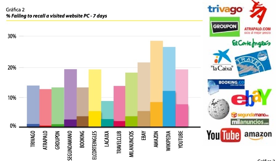 Quisimos entonces lanzarnos con un ejercicio diferente: el recuerdo sugerido. Les preguntamos si habían visitado una lista de páginas web que les compartimos. Para nuestra sorpresa, dependiendo del tipo de contenidos de las páginas, algunas se recordaban mejor en un horizonte de tiempo corto y otras en un horizonte de tiempo más largo. Páginas como Youtube y Wikipeda se recordaban mejor en el largo plazo mientras que otras, como Groupon, fueron recordadas mejor en el corto plazo.