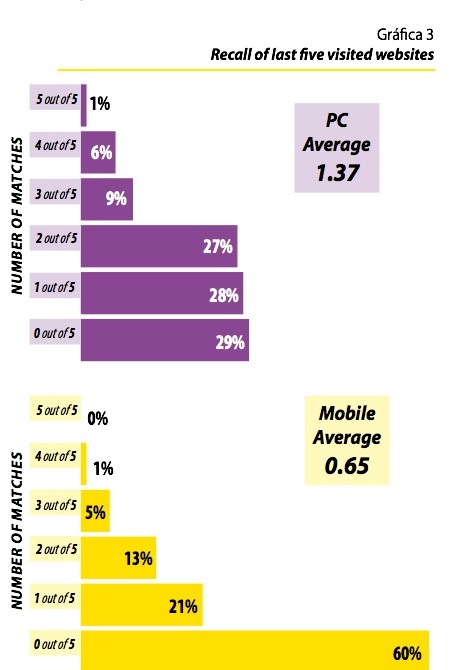 Los resultados anteriores podrían hacer pensar que la fiabilidad de nuestra memoria “digital” no puede ser peor. Sin embargo, todo indica que la situación puede empeorar. Realizamos un ejercicio similar al anteriormente descrito pero con dispositivos móviles. El resultado: mientras que en PC el promedio de recordación de las últimas 5 cinco páginas visitadas era apenas de 1.37, en smartphones fue sólo de 0.65.