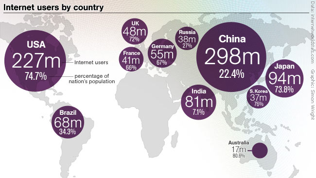 Según IWS (Internet World Stats) el número de internautas ha aumentado un 16% respecto al año pasado alcanzando la cifra de 1.596 millones de usuarios conectados que representa el 23.8% de la población mundial. Esta cifra es un indicativo de la importancia que está adquiriendo internet en todos los países, con especial relevancia en el grupo BRIC (Brasil, Rusia, India y China) como podemos ver en la lista de los países con más internautas: