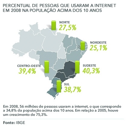 El mercado de Internet en Brasil es el 5º del mundo en número de internautas - 66,3 millones - por detrás de China (285m), EE.UU.(234m), Japón (89m) y la India (86m). Alemania es el país europeo con mayor número de usuarios (61,9m). Sorprende aún más que Brasil detenta a nivel mundial el primer puesto en tiempo de navegación por persona, con 44 horas al mes. (3) El grafico abajo muestra la penetración de Internet por región de Brasil.