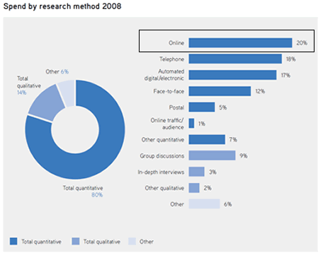 Hace ya unos meses Esomar publicó el estudio anual de la industria mundial de investigación de mercados, en el que entre otras cosas interesantes podemos ver que ya en el 2008, la metodología de investigación online superó al CATI (Computer Assisted Telephone Interviews) por volumen de contratación, suponiendo un 20% de las metodologías en todo el mundo.