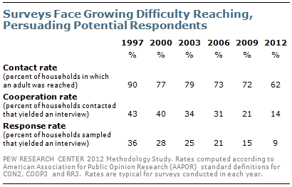 Según un estudio elaborado por Pew Research en base a los datos ofrecidos por la American Association For Public Opinion Research (AAPOR), el ratio de respuesta medio de las encuestas telefónicas en EEUU ha descendido de un 36% en 1997 a sólo un 9% en 2012 (ver tabla a continuación).