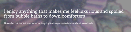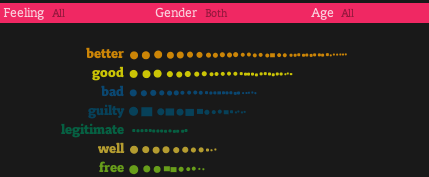 ¿Cómo aprovechar esto para aplicarlo en investigación de mercados? Si el consumo es efímero y la comunicación también lo es, a base de analizar lo que el consumidor comunica en un momento determinado, se pueden extraer insights muy relevantes para el investigador. Esto es lo que podemos ver en Twistori.com (en ingles), una web en la que se muestran aquellos comentarios de todo el mundo en los que aparecen las palabras "I love", "I feel", "I believe" (Creo en... , Me encanta... , Siento...) con el fin de ver que es lo que la gente esta expresando en este momento. Esta idea se basa en la web "we feel fine" que es otro experimento social que rastrea los sentimientos de bloggers de todo el mundo que escriben las palabras "I feel" en su blog. Puedes hacer una búsqueda por edad, localización y (muy curioso esto) por el tiempo que hace en estos momentos en la ciudad de esa persona. Así por ejemplo, si buscamos personas que se sienten felices en el 2008, nos muestra los lugares con mayor felicidad, la comparación con otros sentimientos, la correlación con el clima...