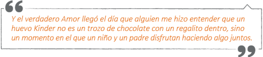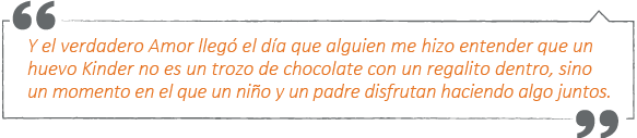 Y el verdadero Amor llegó el día que alguien me hizo entender que un huevo Kinder no es un trozo de chocolate con un regalito dentro, sino un momento en el que un niño y un padre disfrutan haciendo algo juntos. Por eso el regalito es lo suficientemente complicado para que el niño no pueda armarlo solo y pida la ayuda del adulto, y a la vez lo suficientemente fácil para que el adulto decida prestar ese tiempo de su vida a su hijo.