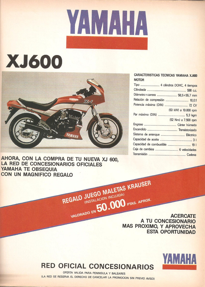 El "claim" de la publicidad es XJ600 y una promoción relativa a un regalo de unas maletas.