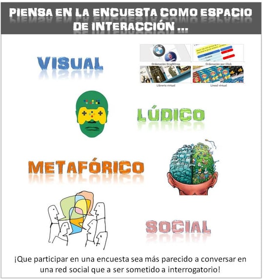 Como 'premio' a tu disciplina e interés, comparto contigo estas ideas para hacer de tus encuestas (mejor dicho de tus actividades de consumer insights research) oportunidades de aprendizaje sobre tus consumidores más adaptadas a la forma en que éstos interactúan en Internet. A la hora de hacer investigación, comunícate con el internauta y piensa en tus herramientas de recolección de información (ej. encuestas) como si fuesen éstas en sí mismas plataformas web o aplicaciones móviles: visual, lúdica, metafórica y social (que se 'sienta' como una conversación).