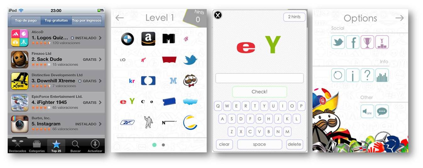 En este momento la aplicación móvil más popular en la tienda de iTunes se llama Logos Quiz, la que en palabras de su propio autor- "se trata de un juego de preguntas muy divertido que consiste en adivinar los nombres de las empresas a las que corresponde cada logo" (imagotipos, anagramas, siglas, pictogramas, etc.).