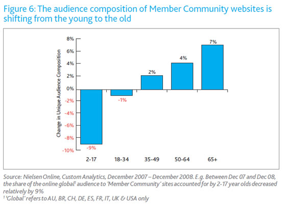 En línea con este incremento presupuestario, los analistas de Nielsen demuestran en otro estudio datos como que en todo el mundo se incrementó un 18% el tiempo dedicado por los internautas a las redes sociales en el año 2008, sólo en facebook el incremento fue de un 566% con una media de 3,1 horas por internauta. En consecuencia, las redes sociales canibalizan el tiempo utilizado por los internautas para otras aplicaciones, como la consulta de su correo electrónico o los chats. En España, se pasó de estar un 6,7% en redes sociales en 2007 a un 12,5% en 2008 lo que supone un incremento del 87%.