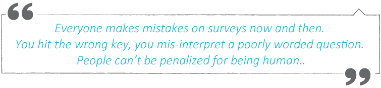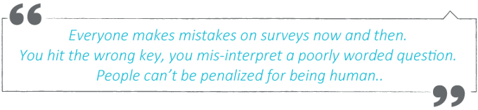 It really helped me to understand that real people aren’t perfect. Everyone makes mistakes on surveys now and then. You hit the wrong key, you mis-interpret a poorly worded question. People can’t be penalized for being human. On the other hand, there are always a few people who aren’t truly invested in the survey process and those kinds of people don’t need to be a part of the process.