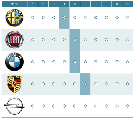 Es la típica 'escala likert' en la que puntuamos de forma individual cada ítem, por ejemplo de 1 a 10. Su forma habitual es la temida matriz. Más simple para el respondent, presenta dos problemas: favorece el empate y el significado de la escala es arbitrario (cada respondent interpreta un 7 a su manera, por ejemplo). Las valoraciones obtenidas suelen comprimirse en un rango de puntuaciones reducido.
