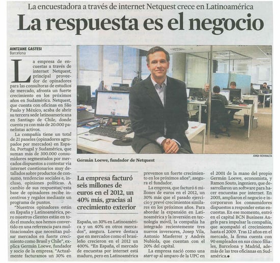 El artículo narra la historia de Netquest desde sus inicios en el año 2001, citando a los fundadores Germán Loewe (actual CEO) y Ramón Souto (Director IT). También, hace hincapié en el crecimiento que está experimentando Netquest en Latinoamérica, en porcentajes de facturación por región. Además, Germán destaca Chile y Brasil como dos de los mercados más potentes en Latinoamérica en los cuales Netquest está presente con oficinas físicas en São Paulo y Santiago de Chile.