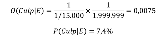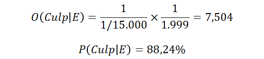 En el cálculo anterior hemos transformado las opciones de culpabilidad en probabilidad directa de culpabilidad, sabiendo que O= P / (1 - P), y por tanto P = O/(1+O).