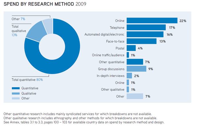 Pese a que durante el 2009 se evidencia un decrecimiento de la inversión en investigación de mercados a nivel global (así como en España y América Latina), se observa una consolidación del uso de investigación online: supone el 22% del mercado, a 5 puntos por encima del CATI y 2 puntos porcentuales más que en 2008.