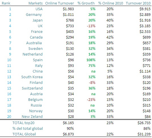 - Otros mercados online como Estados Unidos o Nueva Zelanda logran crecen gracias al crecimiento total de sus mercados pero decrecen en términos porcentuales. Estados Unidos pierde 2 puntos situándose en un 20% (por debajo media global) y Nueva Zelanda pierde 3.