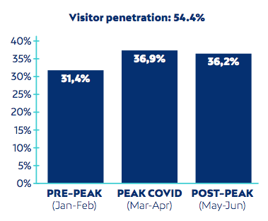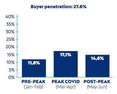 - Hablando ahora sobre la penetración de compras en sitios de venta online de FMCG, se puede observar el gran aumento que hubo entre el pre y el peak de la pandemia, con un porcentaje de 11.8% de enero y febrero a 17.1% en marzo y abril. Para los meses de mayo y junio, la caída fue de un 2.5%. Aún así, la venta online, con 14.6% de penetración de compra durante el post peak, sigue siendo un 2.8% mayor que antes del peak.