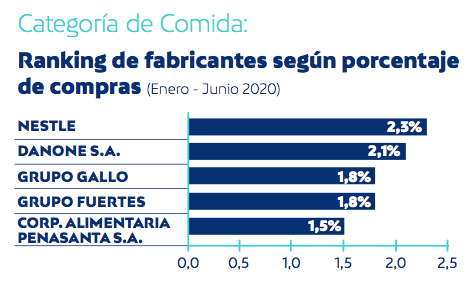 - Por último, si miramos el ranking de fabricantes de comestibles según el porcentaje de compras durante el primer semestre de este año, de enero a junio, podemos ver que la tasa de penetración de compra es liderada por Nestlé, que se lleva un 2.3% y seguida muy de cerca por Danone SA, que tiene un 2.1% de cuota. A los grupos Gallo y Fuertes les corresponde un 1.8% a cada uno, y finalmente encontramos a Corporación Alimentaria Peñasanta SA con un 1.5%.