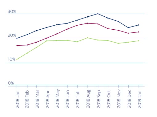 Resulta muy interesante ver que, según la segmentación, el comportamiento es muy parecido en los tres países.