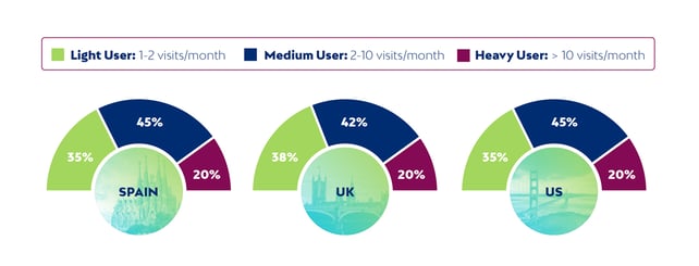 - ¿Y qué sucede en Reino Unido? El 38 % de nuestros panelistas son usuarios esporádicos, el 42 % son usuarios medios y, de nuevo, el 20 % son usuarios intensivos.