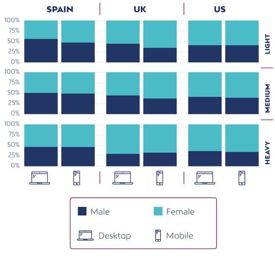 Parece que hay más visitas de dispositivos móviles en el segmento de usuario medio que en los segmentos de usuario esporádico e intensivo. Esto es aplicable tanto a hombres como mujeres, y en EE. UU., España y Reino Unido.