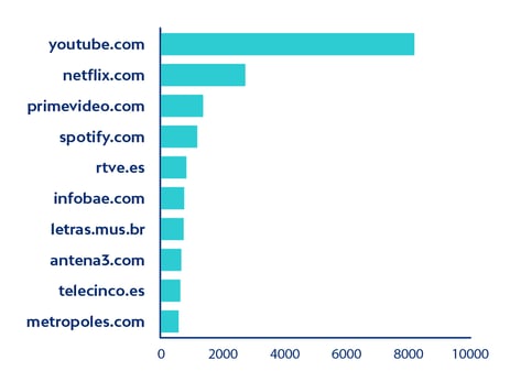 Nuestras panelistas visitaron mayormente “youtube.com”, “netflix.com” (sí, es el segundo lugar) y “primevideo.com”. Un dato interesante es que “spotify.com” es el único sitio de reproducción, solamente de música, que aparece en el listado.