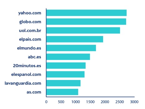 “yahoo.com”, “globo.com” y “uol.com.br” tienen los tres primeros lugares, con 2740, 2723 y 2515 respectivamente. Resalta que el segundo y tercer lugar correspondan a sitios de Brasil, sería interesante profundizar en este tema a futuro y preguntarnos si realmente las mujeres brasileñas están más “informadas” que las españolas o las mexicanas.