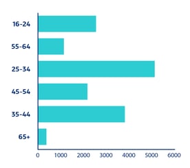 La muestra de panelistas premium que hemos tomado está compuesta de la siguiente manera: 15234 mujeres, de las cuales 5076 son de Brasil, 5196 de México y 4962 de España. De todas ellas, rastreamos la navegación que realizaron entre el 01 y el 31 de enero del 2021 a través de cualquier dispositivo (móvil, ordenador de escritorio, laptop). El grupo de edad más grande de nuestra muestra, corresponde a los 25 a 34 años, con un total de 5142 panelistas, seguidos por el de 35 a 44 con 3829, 16 a 24 con 2559 y 45 a 54 con 2183. El grupo de edad que comprende menos panelistas, es el de mayores de 65 años, con apenas 376.
