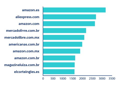 “amazon.es” con 3182 visitantes únicas, “aliexpress.com” con 2690 y “amazon.com” con 2636 son los tres primeros lugares de esta categoría. De hecho 4 de los 10 sitios más visitados corresponden a Amazon, hablando de marketshare...