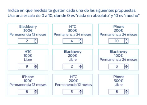 Un estudio Conjoint combina los diferentes niveles de los atributos para crear productos realistas. Por ejemplo, podríamos preguntar por un coche muy seguro, pero muy caro y con bajo nivel de confort. O por un coche menos seguro, pero muy económico y con un nivel medio de confort. Al preguntar por productos, combinamos atributos buenos y malos para el respondiente, y le obligamos a decidir en función de qué es más importante para él. Estas decisiones contienen información realista que nos permite estimar qué atributos están siendo más valorados por el decisor (es decir, tienen mayor utilidad).