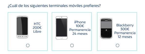 Sin embargo, la auténtica revolución del Conjoint llegó con el CBC o Choice-based Conjoint. En un cuestionario CBC, en lugar de pedir al encuestado que asigne una valoración a cada producto, le mostramos un grupo de productos y le pedimos que elija cuál de ellos prefiere. Elegir entre productos en lugar de asignar un número a cada uno es más natural para el participante. A fin de cuentas, elegir entre varias alternativas es lo que hacemos como consumidores en nuestro día a día.