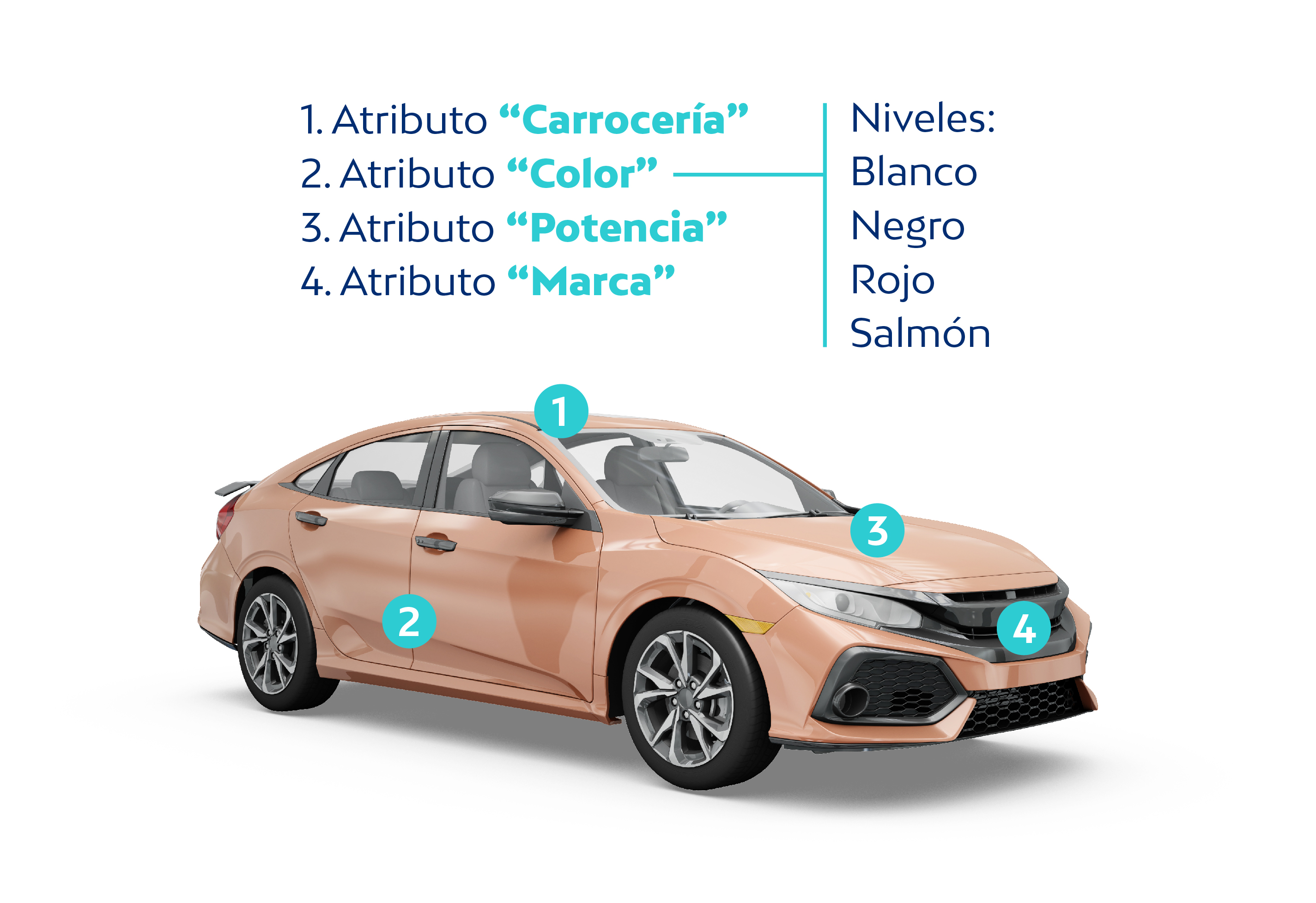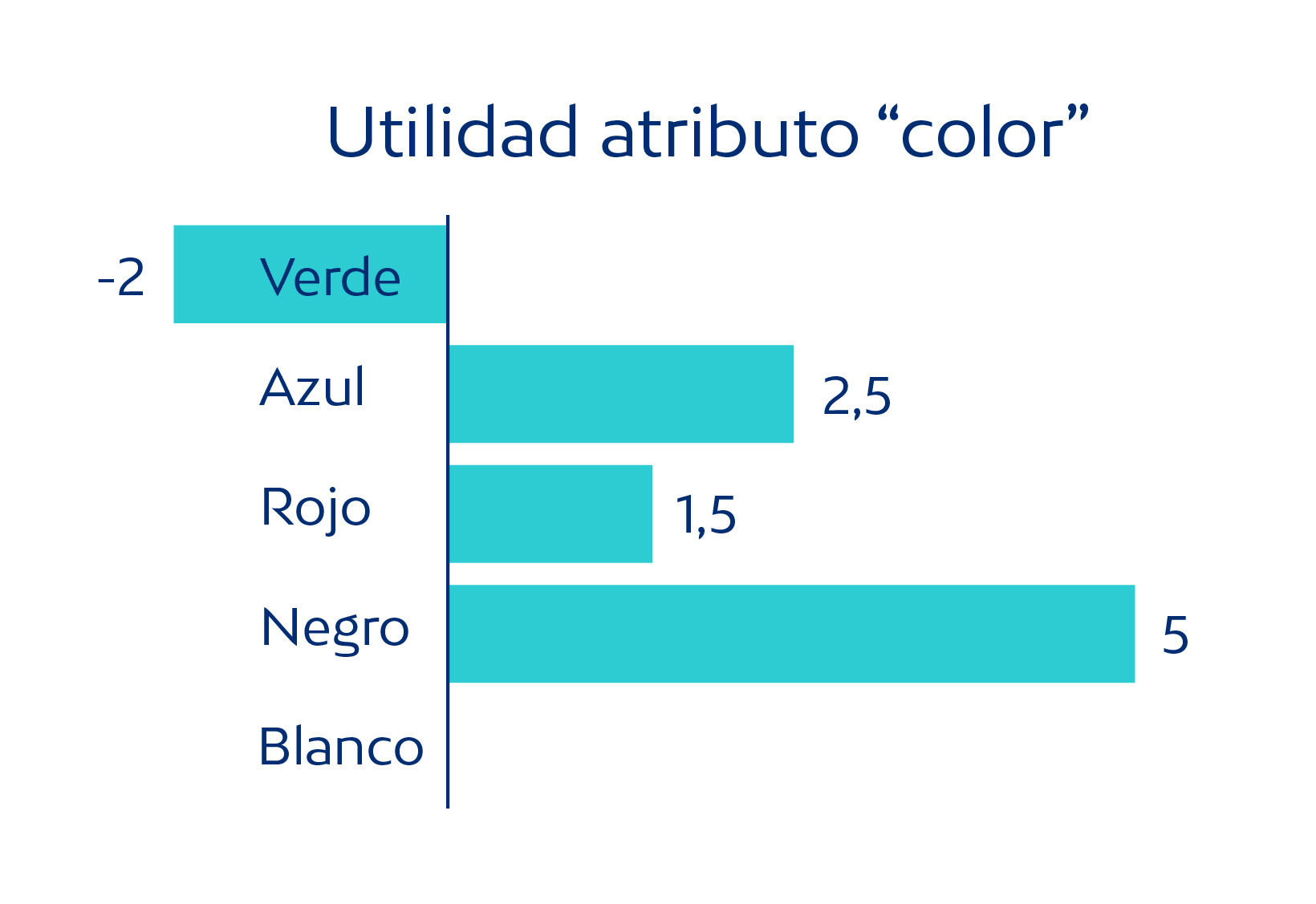 Antes de seguir, un poco de terminología. A partir de este momento, usaremos la palabra atributo para referirnos a una característica de un producto: el color de un coche, el precio del computador, la marca de unos pantalones... Las diferentes alternativas que puede tener un atributo, las denominaremos niveles. Así, por ejemplo, el atributo color de un coche podría tener 5 niveles “blanco, negro, rojo, azul y verde”. Por último, el valor que un usuario percibe de un atributo-nivel recibe el nombre utilidad. Trataremos de respetar esta nomenclatura de aquí en adelante.