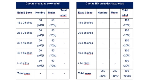 Las cuotas son las proporciones que imponemos a una muestra (p.e. en cuanto a sexo, edad, región…) para que ésta se parezca a la población que queremos estudiar. Si fijamos más de una cuota en una muestra (p.e. sexo y edad), debemos escoger si aplicamos cuotas cruzadas o no cruzadas. Te explicábamos en este otro post el impacto de usar cada una de estas dos modalidades.
