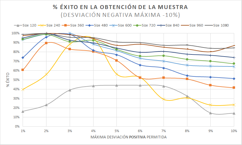 2. Fijando una desviación negativa de -10%, a medida que incrementamos la desviación positiva mejoramos el % de éxito, pero al seguir incrementando empeoramos. Por lo tanto, hay un óptimo en medio.