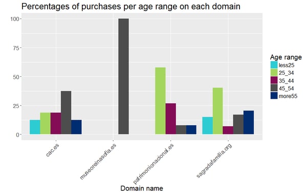 Online buyers of the websites patrimonionacional.es and sagradafamilia.org are more likely to be aged [25, 34]. Those of the domain museoreinasofia.es are bound to be aged [45, 55], while those from cac.es are quite spread in terms of age. And regarding the time frames when those purchases were carried out, it seems that preferable times are night time and afternoon. Even though half of the purchases on cac.es happened on the early morning time frame, it seems to be the continuation of the night time. This is coherent with the previous analysis, where we learnt that users preferably visit at the afternoon or at night.