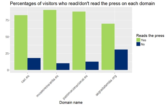 We can observe no critical difference between the percentages of men and women who visited these websites. However, we did find differences regarding the other three variables. The social class is clearly indicating that the middle social class visits these websites more often than the high class and the low class. The variable indicating whether the users have kids is suggesting that the Ciutat de les Arts i les Ciències may be more children-friendly than the other three options. And finally, most visitors to museum-related websites read the press.