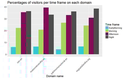 We generated the new variable time_frame for our example. We decided to split the timestamp information into 4 time periods: Early morning (00-06h), morning (06-12h), afternoon (12-18h), and night (18-00h). After grouping by domain and aggregating the