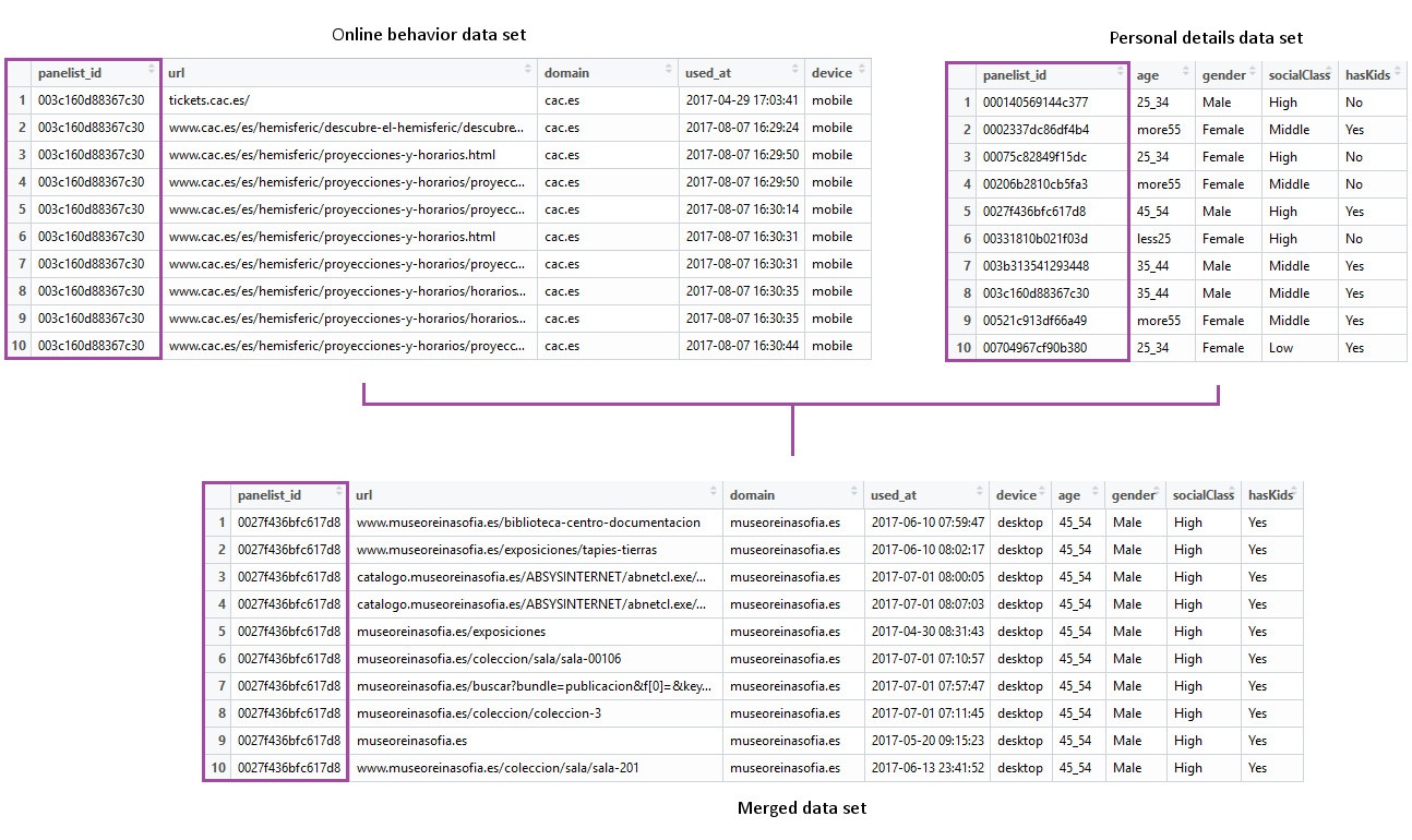The idea behind this analysis is to group by domain name again, and to aggregate the personal details of the people who accessed each domain, since that will give us a profile of its visitors. However, we don’t have that information on our data set. What we do have is a variable storing who performed each of the online visits, the panelist ID. On the other hand, since those visitors are Netquest panelists, we have tones of personal data we can use, and their associated to a panelist ID too. Then, all we need to do is to match the IDs of the panelists, and to add the personal details to our original data set. Consequently, each observation in the merged data set will include the URL accessed, the timestamp, the device used, the domain name, who performed that online visit, in addition to all the personal details we need to form the users profile. We can now group that data grouping by domain name and get percentages of each of the features of the users. Thus, we will have built a profile of the users of each domain with very little effort.