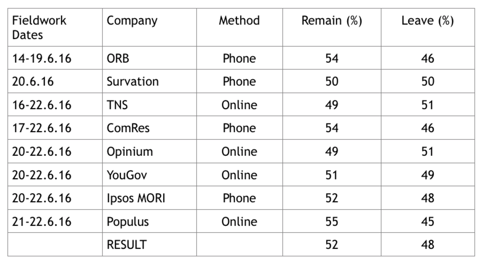 - Survey respondents not being a representative sample of potential voters (for whatever reason, Remain voters being more reachable or more likely to respond to the poll, compared to Leave voters)