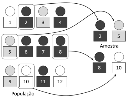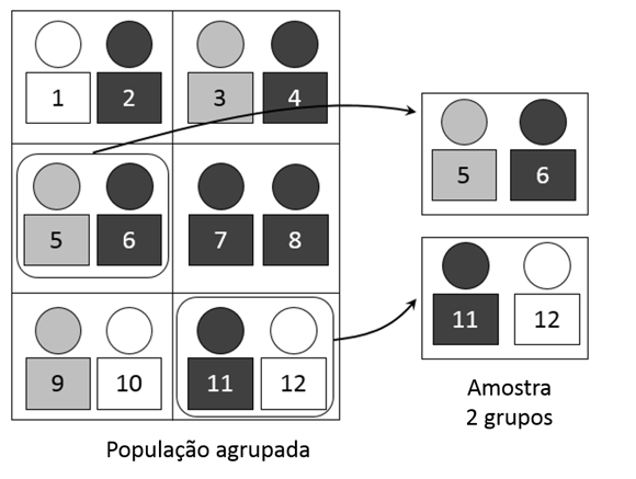 A amostra por conglomerados é uma técnica que explora existência de grupos (clusters) na população. Esses grupos representam adequadamente a população total em relação a característica que queremos medir. Em outras palavras, estes grupos contêm variabilidade da população inteira. Se isso acontecer, você pode selecionar apenas alguns desses conglomerados para realizar o estudo, conforme ilustra a figura.