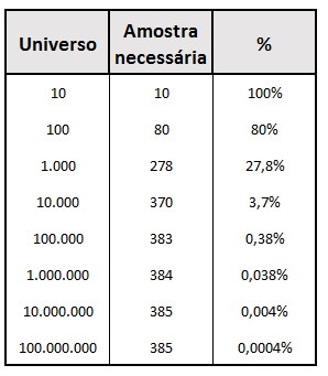 Mas o tamanho da amostra tem uma propriedade fundamental que explica o porquê a amostragem utiliza diversas áreas do conhecimento. Esta propriedade pode ser resumida da seguinte forma: a medida que estudamos universos maiores, o tamanho da amostra cada vez mais representa uma porcentagem menor desse universo.