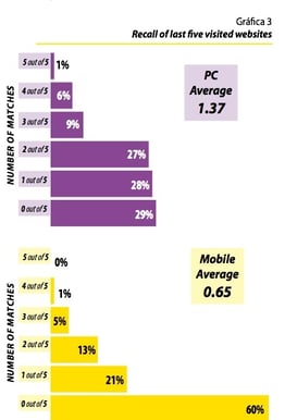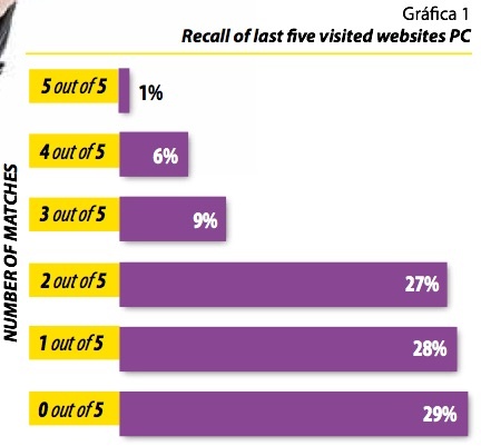 Em primeiro lugar, pedimos aos nossos painelistas que nos dissessem as últimas 5 páginas que visitaram em seu computador e nós comparamos com os dados registrados, sem ter em conta a ordem do que foi mencionado. Os resultados foram surpreendentes! Apenas 1% dos entrevistados acertaram as 5 páginas declaradas. 6% acertaram 4 páginas e 9% lembrou-se de 3 páginas. 84% das pessoas recordaram de 2 páginas. Os dados reforçam o que havíamos comentado desde o início: a baixa recordação no comportamento do mundo digital.