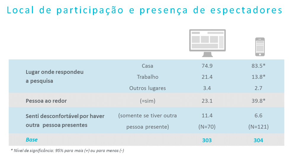 Resposta da grande maioria: a partir de casa, mesmo em smartphones. Semelhante a um estudo experimental na Espanha. Diferenças significativas entre PC e SM para casa e no trabalho: mais membros do painel respondem a partir do local de trabalho ao usar PC de smartphones (parece lógico), enquanto mais resposta de casa para smartphones. Não houve diferenças significativas para "outros lugares": a ideia de que SM são mais móveis não é verdade quando se fala a ação de responder pesquisas. Os entrevistados estão respondendo a partir de casa / local de trabalho, mesmo quando utilizam os smartphones.