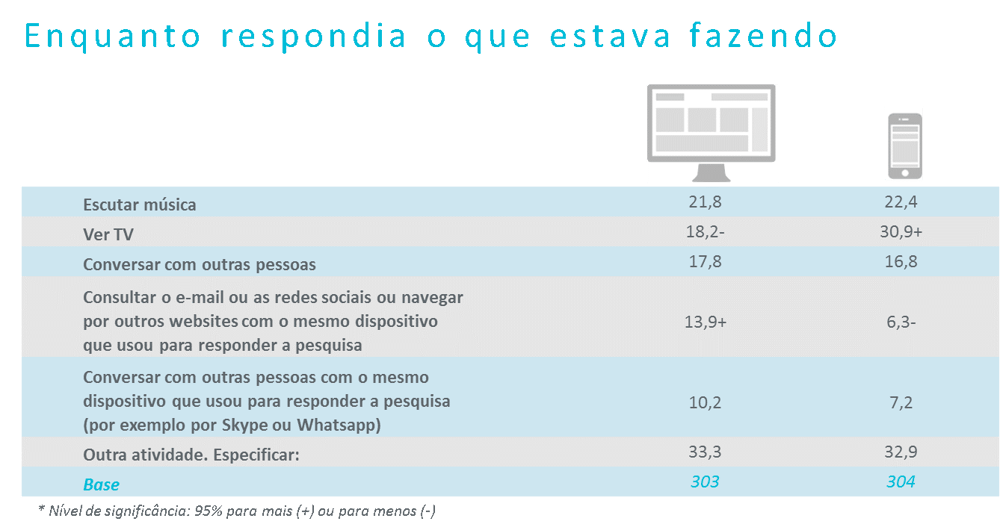 Já quem acessou e respondeu a pesquisa via PC é significativamente maior a opção de consultar e-mails, navegar na internet enquanto responde a pesquisa. Muito provavelmente se deve ao fato de eles acessarem as pesquisas mais no ambiente de trabalho.