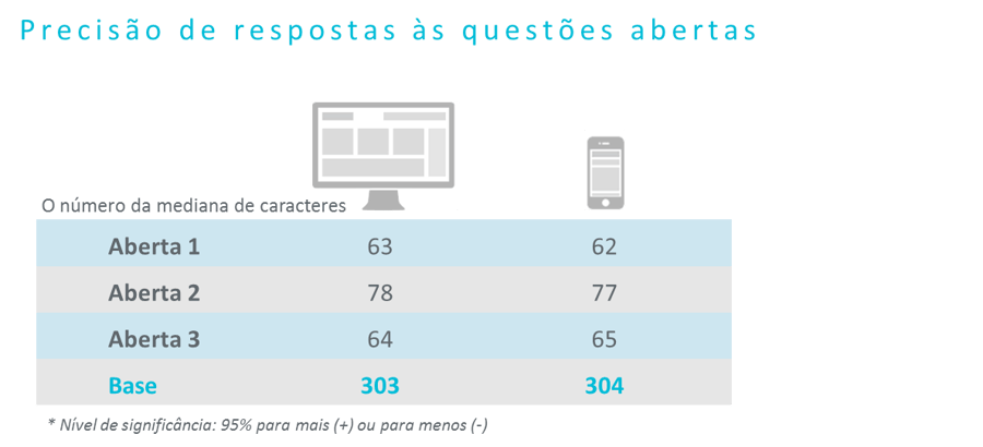 Nós particularmente não esperávamos diferenças entre PCs e SM para questões que exigem digitação, por causa dos diferentes tipos de teclado e tamanhos. Assim, comparamos a precisão de respostas às questões abertas através de três questões.