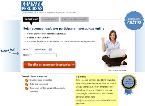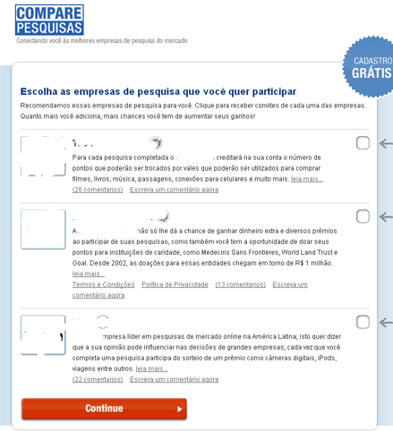 O slogan do site é uma declaração evidente de suas intenções: “COMPARE PESQUISAS conectando você às melhores empresas de pesquisa de mercado”. E a afirmação é 100% verdadeira. Você acessa o site, indica sexo e idade, e ele lhe oferece registro nos principais painéis online de pesquisa existentes. Completando um simples formulário, eles mesmos se encarregam de registrar a todos de forma automatizada e massiva (a página de registro está encabeçada pela frase “Quanto mais você adiciona, mais chances você tem de aumentar seus ganhos!”). E não estamos falando de painéis pequenos de empresas locais, mas sim de “grandes” painéis internacionais, painéis que estão dando suporte a uma parte importante de produção mundial de pesquisas.