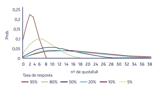 Se observarmos a linha rosa que representa um painel com um 80% de taxa de resposta, vemos que a probabilidade de fechar este estudo sem quota-full é apenas de 2,6%, e no pior dos casos teremos um máximo de 26 quota-full. Em um painel com 95% de taxa de resposta nunca teríamos mais de seis quota-full para completar um estudo. Pelo contrário, os resultados pioram progressivamente em painéis com taxas de resposta mais baixas, até que se estabilizam a partir de 20% aproximadamente.