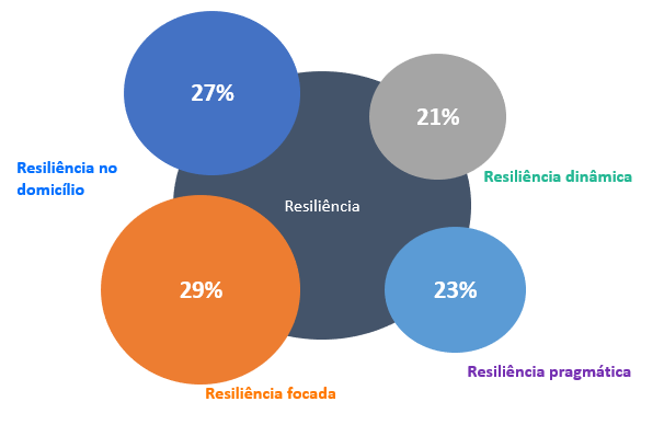 2. Resiliência focada. Equivale a 29% dos entrevistados e também são domicílios de classe média a média baixa de adultos de 25 a 44 anos nos quais também vivem seus filhos. A grande diferença em relação ao grupo anterior é que este foi um dos grupos que mais sofreu em termos de renda e trabalho. São pessoas que declararam que sua vida é muito similar a de antes da pandemia, pois continuaram indo ao trabalho de forma presencial e não percebem ter mais tempo livre. Estão focados em levar o dia a dia com gastos principalmente em produtos e serviços básicos como a moradia e a manutenção de seus domicílios.