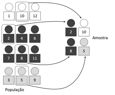 Exemplo: Se você deseja garantir que tanto homens quanto mulheres sejam representados em sua amostra, divide a população por gênero e seleciona uma amostra proporcional de cada grupo.